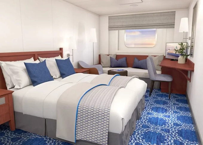 XBO - Kajuta s oknom Cosmos / obmedzený výhľad 14 m². Neotvárateľné okno s obmedzeným výhľadom. 6,7. paluba. Max 4 osoby. 958 € 479 € za osobu