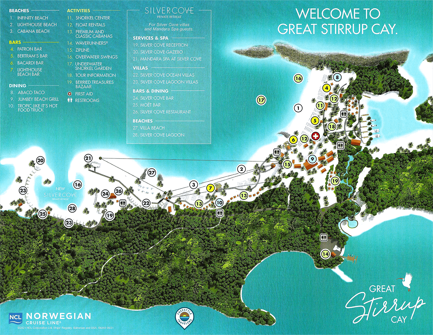 • Great Stirrup Cay usedí s ostrovom Coco Cay (Little Stirrup Cay), súkromným ostrovom spoločnosti Royal Caribbean Cruises.