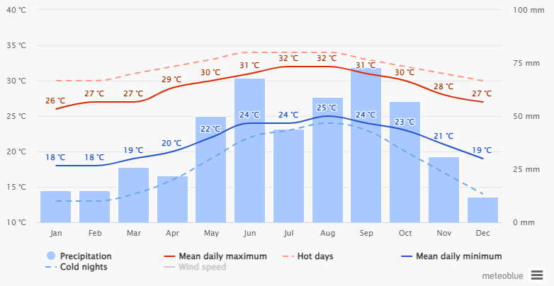 Priemerná teplota mora od mája do novembra je 27 až 30 °C, a od decembra do apríla 25 °C.